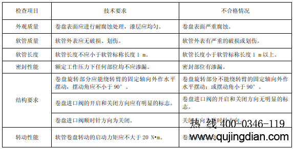 6.8.5.2.1 目測(cè)檢查消防軟管卷盤(pán)外觀(guān)質(zhì)量、軟管質(zhì)量和結(jié)構(gòu)要求,用鋼卷尺測(cè)軟管長(zhǎng)度,用直角尺測(cè)卷盤(pán)擺動(dòng)角。
